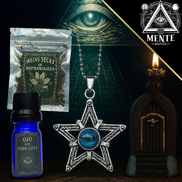 Este ritual se inspira en antiguas prácticas de protección utilizadas por guardianes místicos para sellar portales energéticos y resguardar el alma de intrusiones espirituales. La estrella sagrada con el Ojo que Todo lo Ve representa la vigilancia eterna, capaz de detectar y neutralizar cualquier amenaza. Las hojas secas de destrancadera, utilizadas desde tiempos coloniales en rituales de limpieza, rompen obstáculos y liberan caminos cerrados. La vela de Cérbero, el mítico perro de tres cabezas que custodia las entradas al inframundo, actúa como centinela espiritual, mientras que el aceite consagrado potencia la conexión con estas fuerzas protectoras. Juntos, forman un escudo que blinda de todo mal a quien lo activa.
